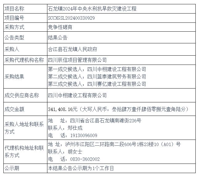 石龙镇2024年中央水利抗旱救灾建设工程 竞争性磋商结果公告