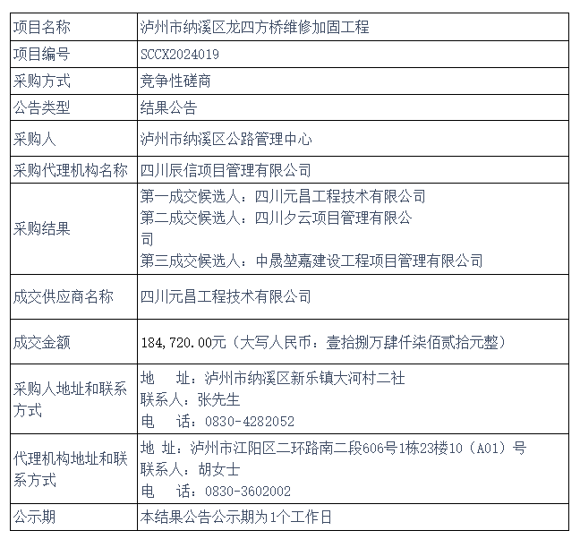 泸州市纳溪区龙四方桥维修加固工程 竞争性磋商结果公告