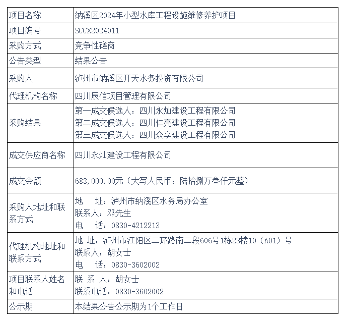 纳溪区2024年小型水库工程设施维修养护项目 竞争性磋商结果公告