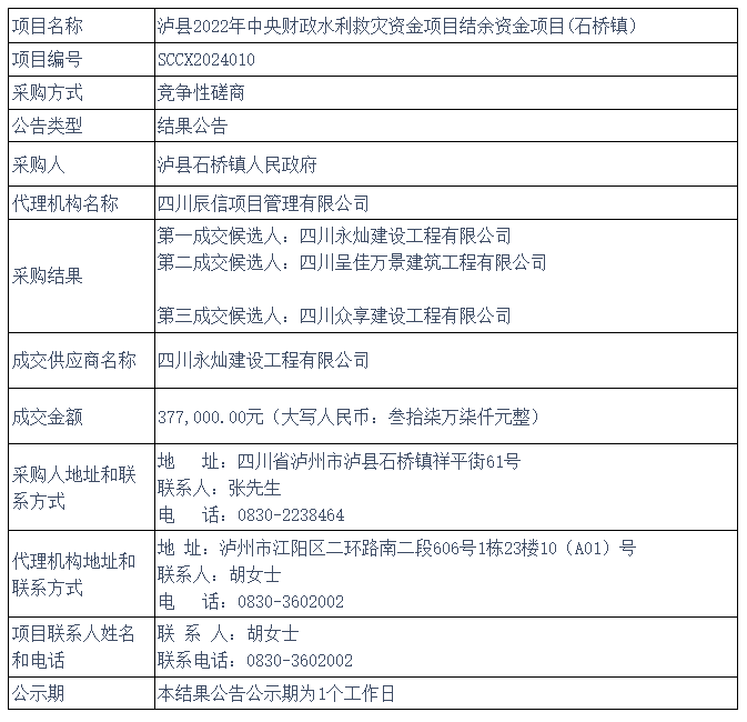 泸县2022年中央财政水利救灾资金项目结余资金项目(石桥镇)竞争性磋商结果公告