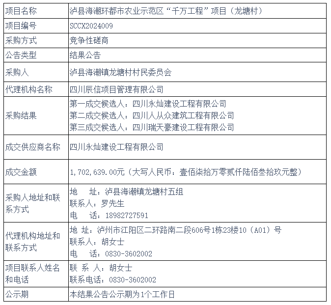 泸县海潮环都市农业示范区“千万工程”项目(龙塘村) 竞争性磋商结果公告