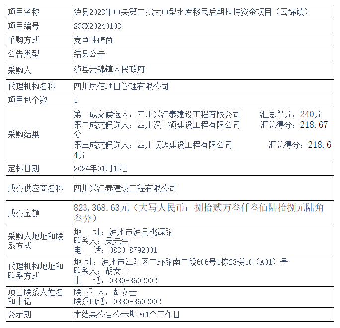 泸县2023年中央第二批大中型水库移民后期扶持资金项目(云锦镇)竞争性磋商结果公告
