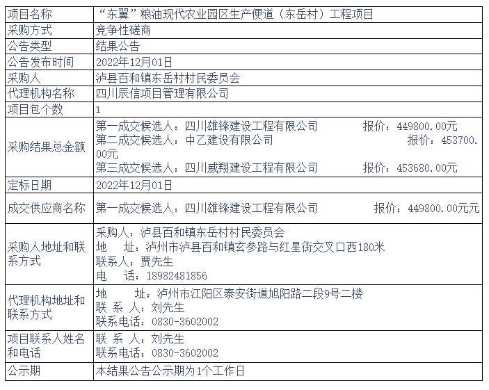 “东翼”粮油现代农业园区生产便道(东岳村)工程项目竞争性磋商结果公告